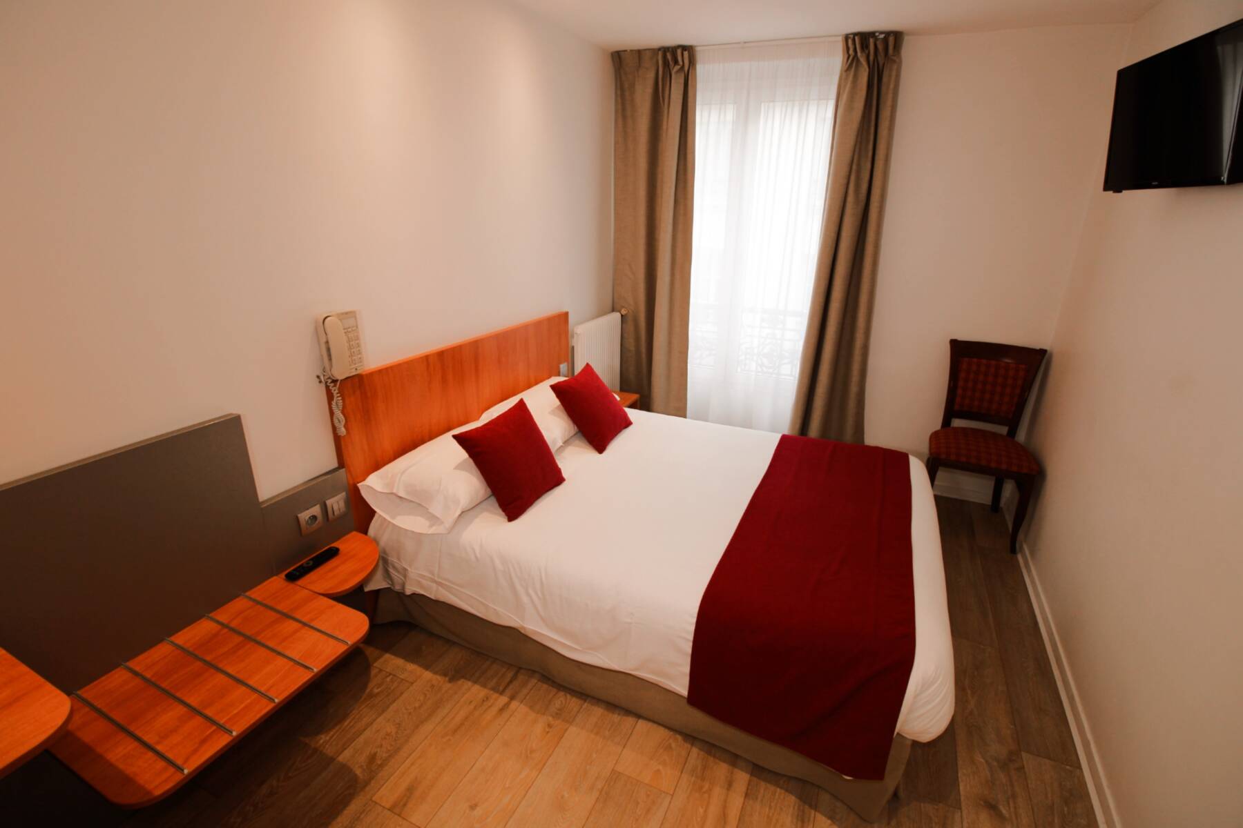 Nos chambres Double standard sont équipées d’un lit double et bénéficient de différents équipements (tv, wifi, produits d’hygiène, bureau, coffre-fort, multiples prises, téléphone fixe) qui sauront rendre votre séjour agréable.
